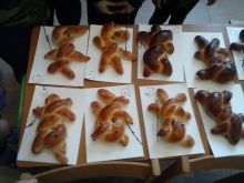 Děti ve třídě Sluníček pekly čerty z kynutého těsta. Při jejich výrobě si ráno zadělaly těsto, pojmenovávaly suroviny, které do těsta patří, každý si zkusil těsto prodělat vařečkou. Pak děti pozorovaly, jak těsto kyne. Čerty si děti vyráběly z dlouhého válečku, ten zatočily, zakroutily, přidaly další váleček jako ruce, menší váleček jako rohy. Místo očí děti zapíchaly voňavé hřebíčky, jazyk udělaly z mandle. Hotové čerty si děti potřely rozšlehaným vajíčkem a poslali jsme je do kuchyně paní kuchařkám upéct. Když jsme se vrátili z vycházky, čekali už na stole upečení čerti a krásně voněli. Děti si je odnesly domů a druhý den vyprávěly, jak si na nich s rodinou pochutnaly.