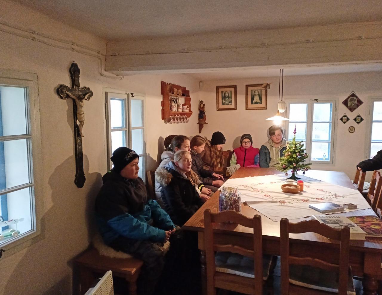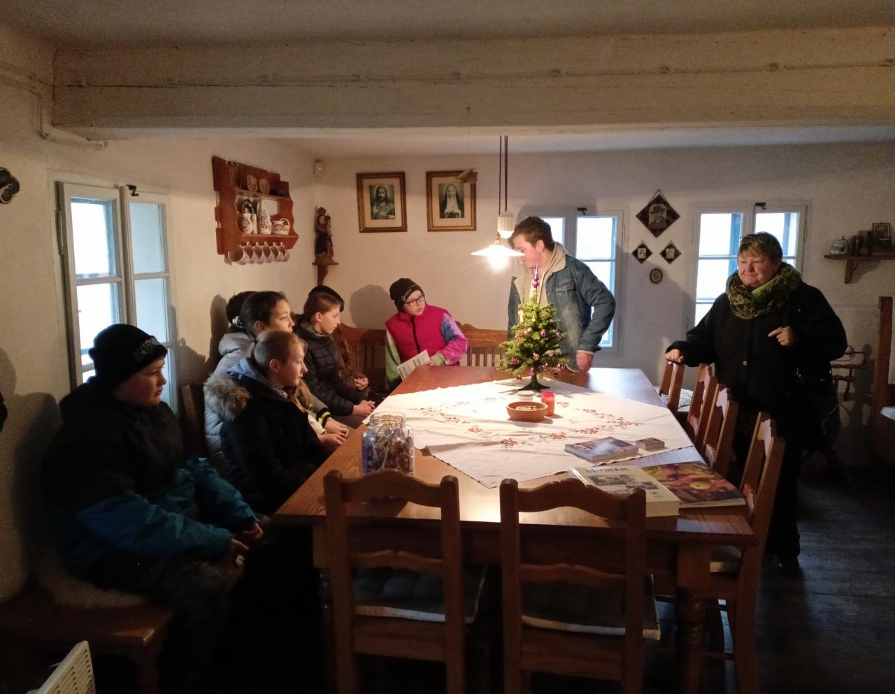2. 12. se žáci 6. třídy byli podívat na historické památky obce Letiny - kostel sv. Prokopa a roubenku. Viděli tedy jak nejstarší památku obce, gotický kostel, tak krásně udržovanou roubenku, připomínající život lidí v předminulém století. Možná nejvíc děti zaujala historická pec, aspoň soudě podle dotazů na pečení chleba i koláčů, ale líbil se jim i krásně vyřezávaný betlém v kostele a další památky.